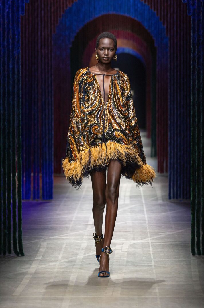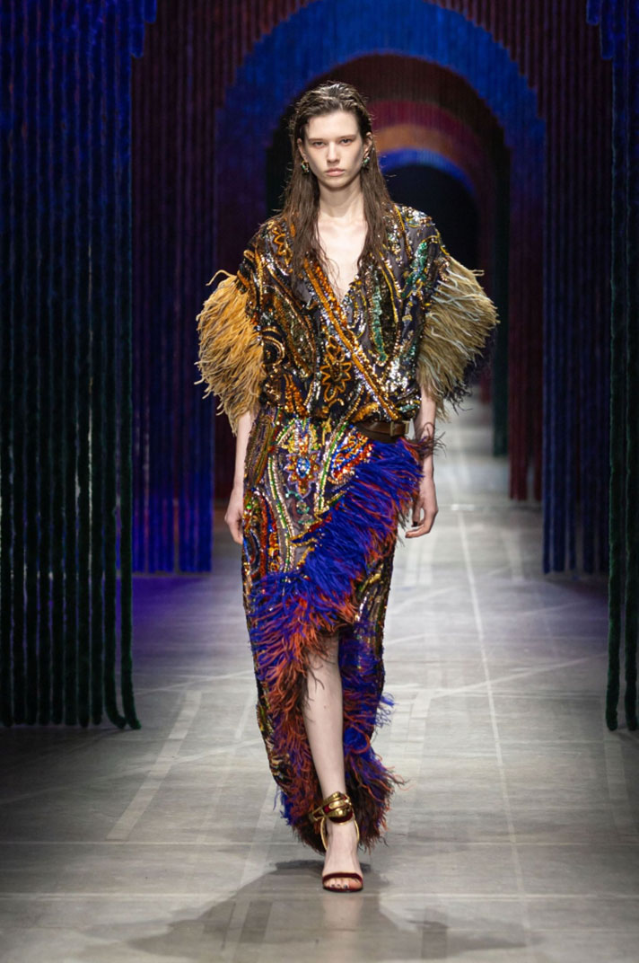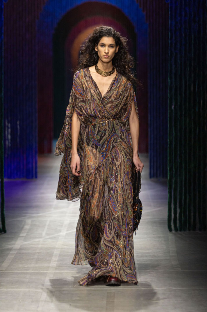 Já a Etro interpreta o bordado com uma sensibilidade boho-luxo, combinando referências étnicas, riqueza ornamental e uma paleta intensa.