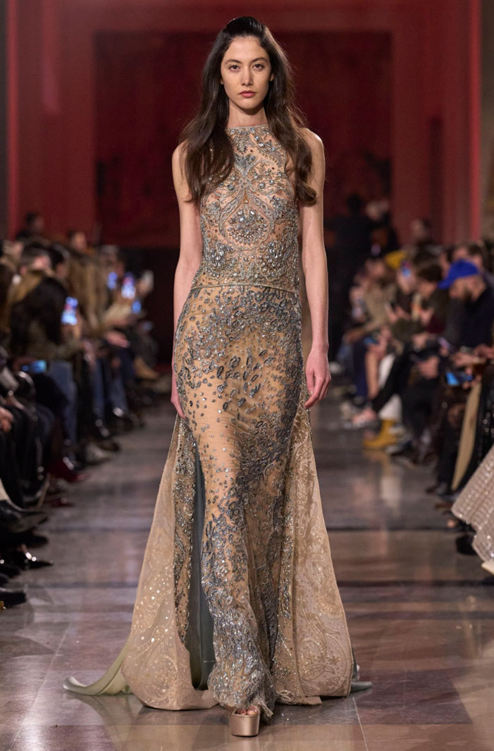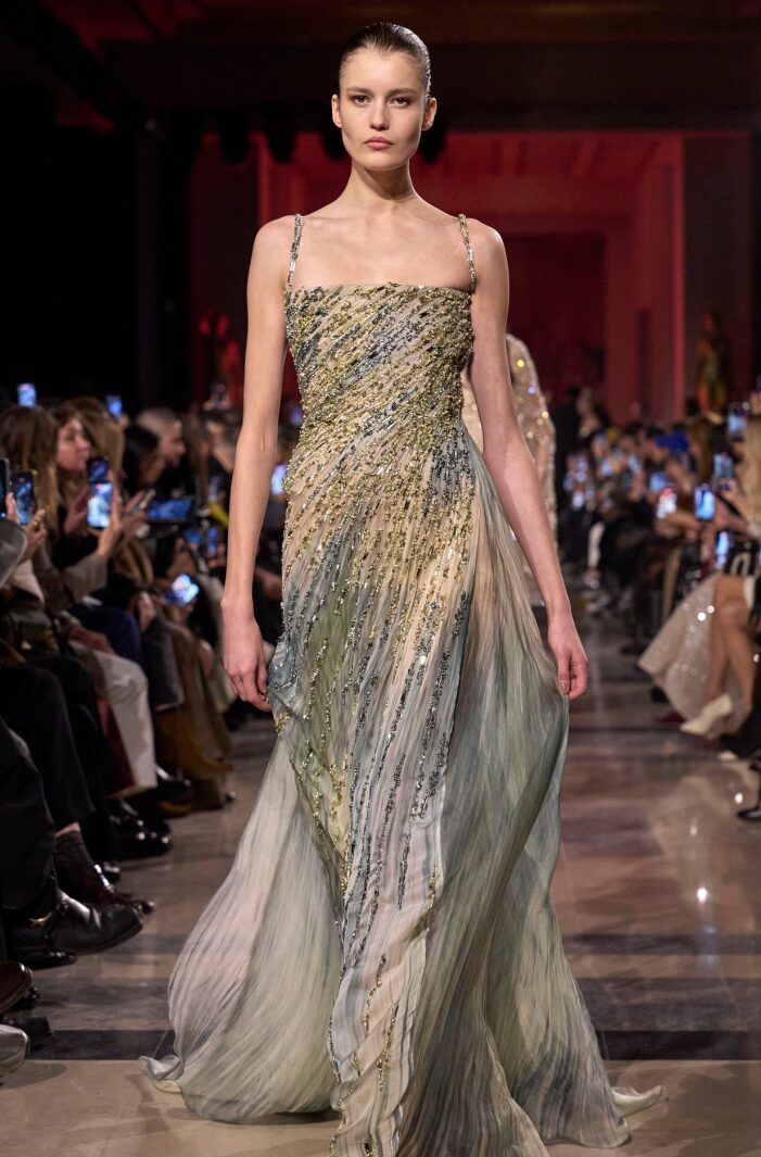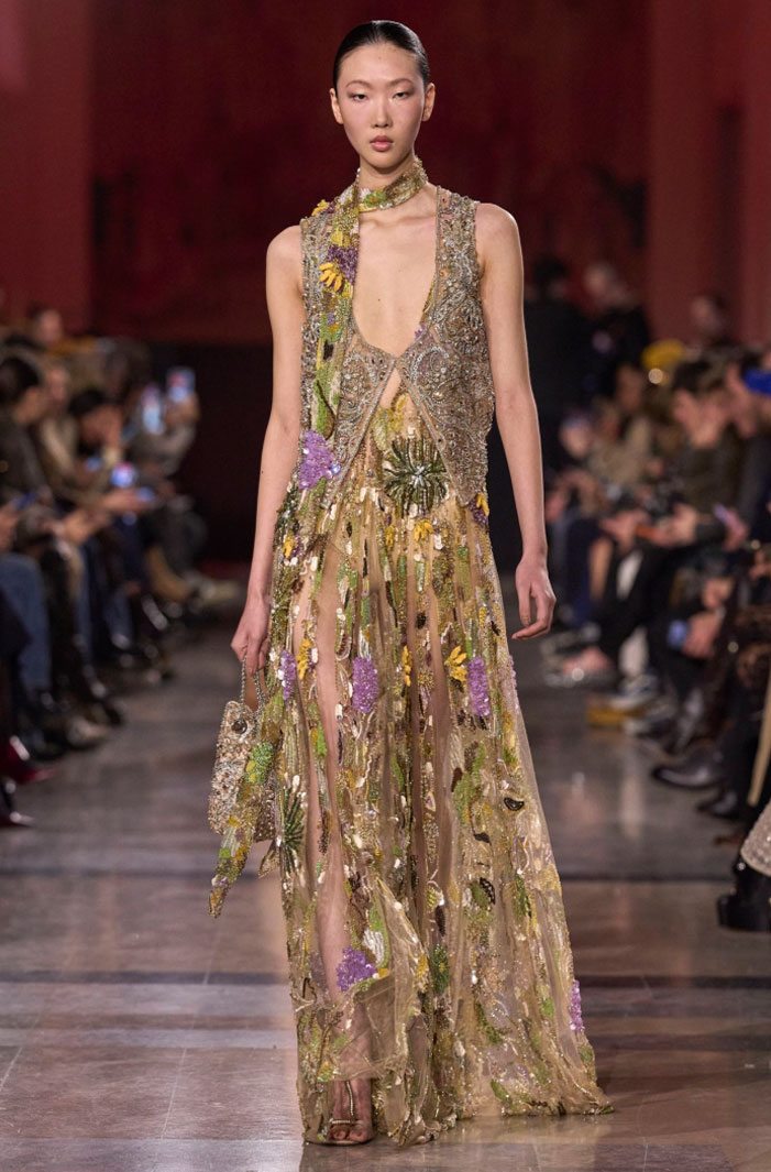 Nas passarelas, o tema aparece com diferentes leituras. A Elie Saab reafirma sua assinatura glamourosa com bordados que vão muito além dos florais luminosos e delicados. A maison explora arabescos ornamentais, geometrias sutis, padronagens inspiradas em rendas e composições que evocam vitrais e elementos da natureza.