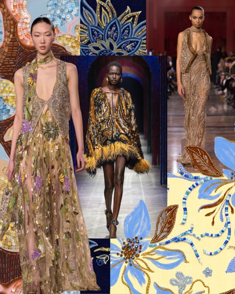 O bordado deixa de ser acabamento para se tornar protagonista, criando relevo, brilho e profundidade.
